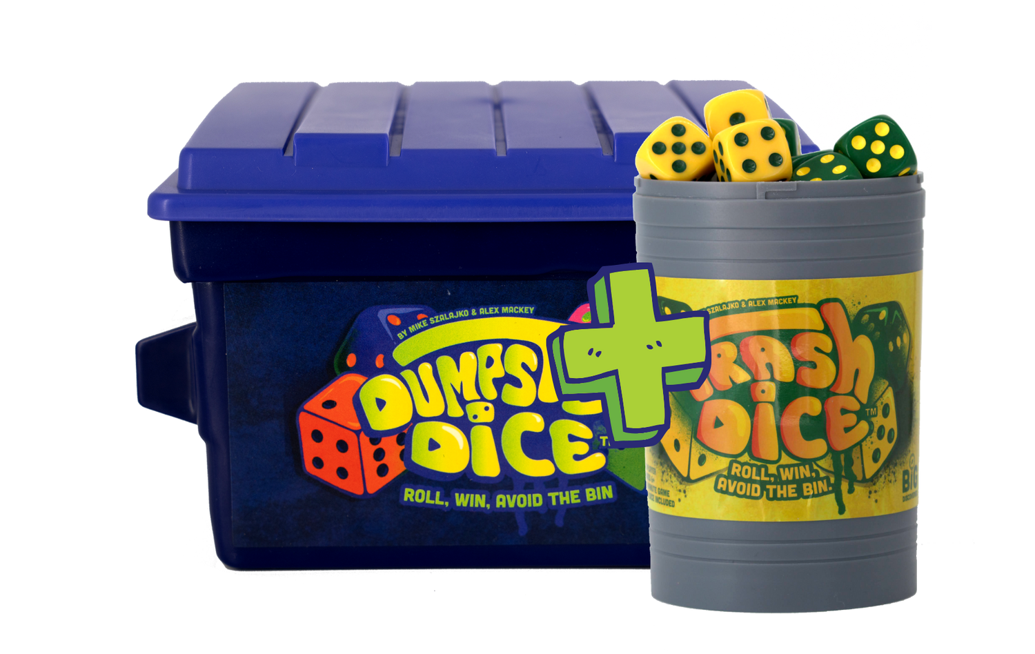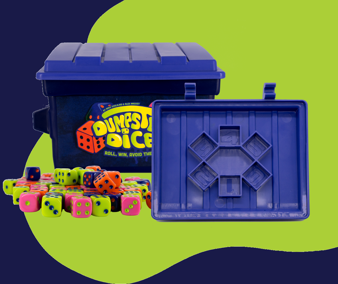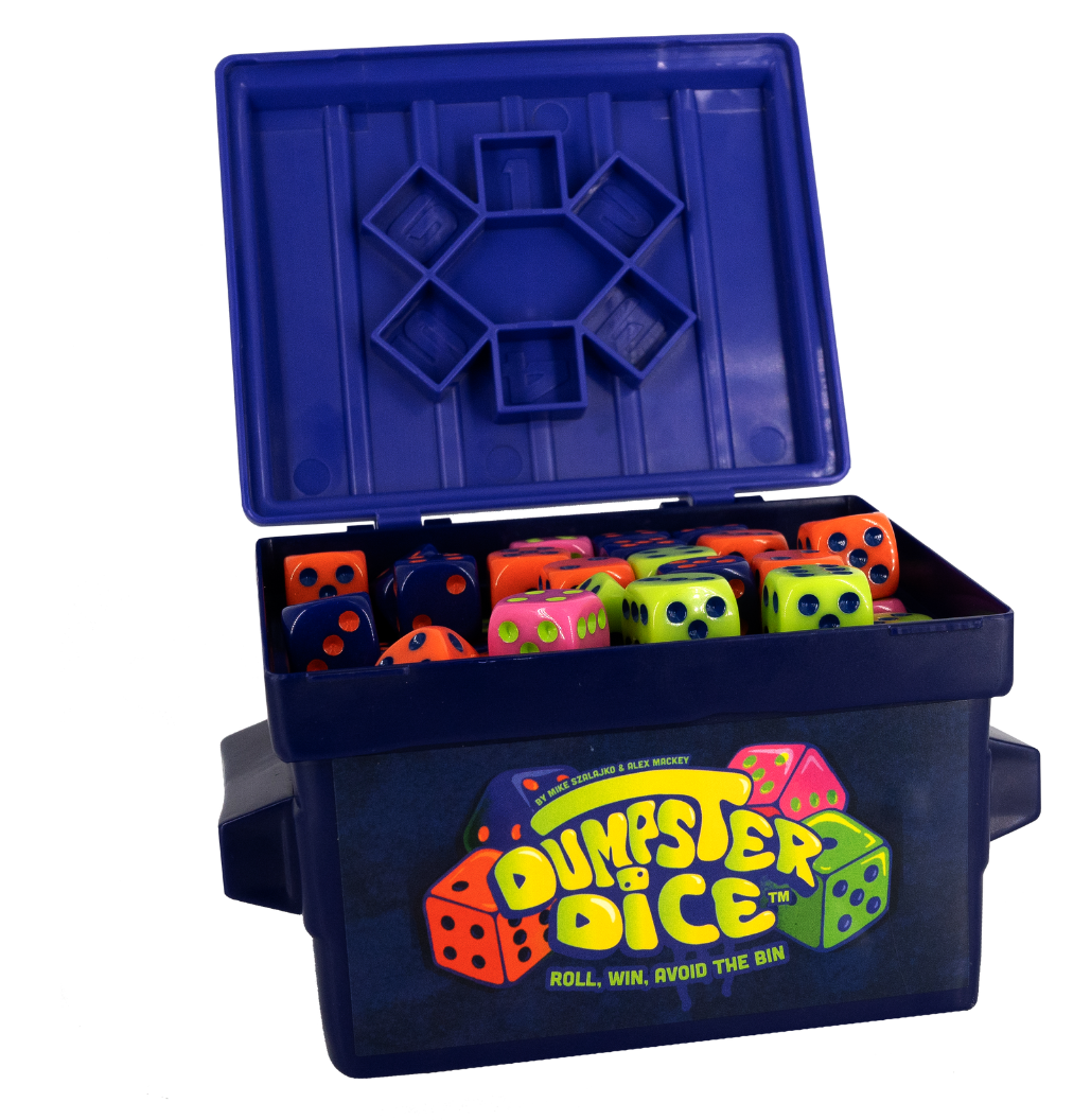 Roll, win, and avoid the bin! In Dumpster Dice, roll to complete the numbered spaces on the lid while avoiding sending your dice to the dreaded dumpster. Dumpster Dice is an easy-to-learn, fast-paced game. With multiple ways to play, it’s perfect for family game nights. Combine it with Trash Dice for a bigger, crazier experience!