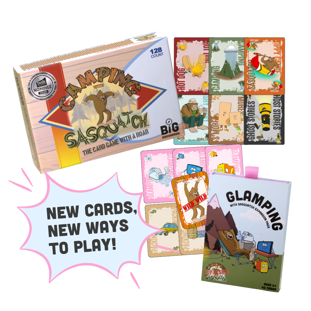Looking for the perfect family card game with a wild twist? The Camping with Sasquatch + Glamping Expansion Pack bundle delivers fast-paced, laugh-out-loud fun for all ages!